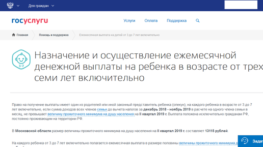 20 мая 2020 года на сайте Госуслуги появилась новая услуга - Назначение и осуществление ежемесячной денежной выплаты на ребёнка в возрасте от трёх до семи лет включительно. В самом начале услуги уточняется, что получить выплату может семья, где доход ниже прожиточного минимума по региону за 2 квартал 2019 года. Если заявление будете подавать в мае, то доход семьи будет учитываться за период с ноября 2018 года по октября 2019 года. Соответственно, если заявление подать позже, то и доходы семьи будут учитываться за другие, более поздние месяцы...