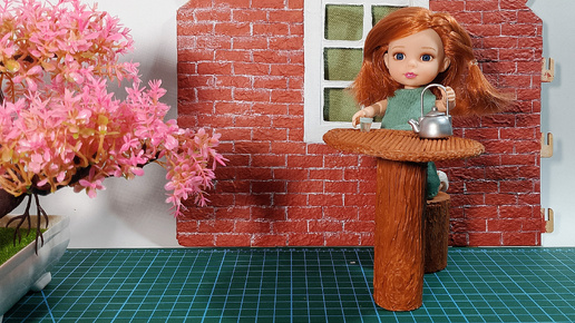 Здравствуйте гости канала и подписчики! В этой статье сделаем столик на балкон кукольного домика.  Сначала была идея сделать столик, стилизовав ножку стола под пенек с корнями. Но из тех материалов, из каких попытались сделать, не понравилось как смотрится. Возможно получилось бы не плохо из полимерной глины, но необходимого цвета даже с фольгой бы не хватило. В результате оставили просто в виде пенька. Для столика понадобиться: втулка от фольги, плёнки или туалетной бумаги, картон для столешницы...