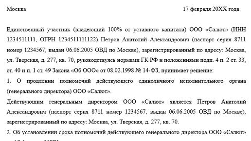 Образец решения о продлении полномочий директора ООО - единственного учредителя