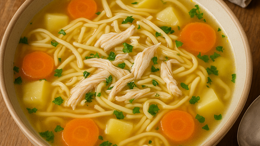 Каждое воскресенье в доме моей бабушки пахло куриным супом с лапшой. Этот аромат невозможно забыть: он возвращает к детству, к тёплой кухне и спокойствию. Сегодня я хочу поделиться с вами не просто рецептом, а настоящим секретом домашнего куриного супа с лапшой — простого, питательного и душевного блюда, которое под силу приготовить каждому. Этот суп — классика, которая никогда не выйдет из моды. Он: Главный секрет — в бульоне и правильной последовательности шагов. Если сделать всё правильно, получится прозрачный, ароматный суп с нежным мясом и упругой лапшой...