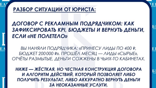 📑 Договор с рекламным подрядчиком: как зафиксировать KPI, бюджеты и вернуть деньги, если «не полетело» 🟦 Ситуация Вы наняли подрядчика: «принесу лиды по 400 ₽, бюджет 200 000 ₽». Прошёл месяц — лиды «сырые», отчёты размытые, деньги сожжены в чьих-то кабинетах. Ниже — жёсткая, но честная конструкция договора и алгоритм действий, который позволяет либо получить результат, либо аккуратно вернуть деньги за неоказанные услуги. 1) 🧩 Предмет и артефакты: из воздуха — в документы Артефакты этапа:...