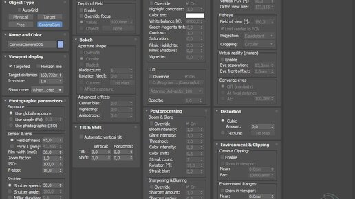 Сегодня речь пойдет о настройках Corona Camera в 3ds max и мы разберемся за что отвечает каждая функция 1. Viewport Display Данная вкладка отвечает за параметры отображения камеры во вьюпорте. Targeted – данная функция включает/выключает отображение во вьюпорте точки фокусировки камеры (Taegeted). Horizon line – данная функция включает/выключает «отображение линии горизонта» во вьюпорте. Target distance – расстояние к таргету камеры. Icon size – настройка размера камеры во вьюпорте. 2. Photographic parameters...