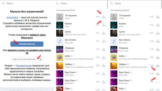 Социальная сеть «ВКонтакте» анонсировала изменения, которые затронут её музыкальный раздел с 30 августа. Условия станут хуже для тех, у кого нет подписки VK Combo, а подписчикам будут предоставлены дополнительные преимущества, которых не было ранее. @AudioBot в Telegram. Эта вспомогательная программа, которая помогает пользователю бесплатно скачивать аудиозаписи из «ВКонтакте» в мессенджер Telegram, слушать любимые песни без ограничений, даже когда закончился трафик или нет интернета. 1. Добавьте бота, отыскав его по имени @AudioBot через поисковую строку...