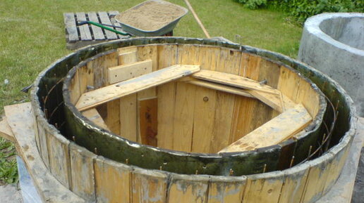 Бывают ситуации, когда готовые железобетонные кольца, выпускаемые многими заводами ЖБИ, не устраивают застройщика по каким-либо причинам. Среди таких причин я могу назвать скверное качество продающихся поблизости плит и колец, высокую стоимость их доставки и установки, отсутствие техники для монтажа, невозможность подъезда к участку и работы на нём тяжелой техники, да просто недостаток средств на их приобретение. В этих случаях вполне возможно изготовить такие изделия на месте, закупив цемент, песок, щебень, материалы для опалубки и взяв недельку отпуска...