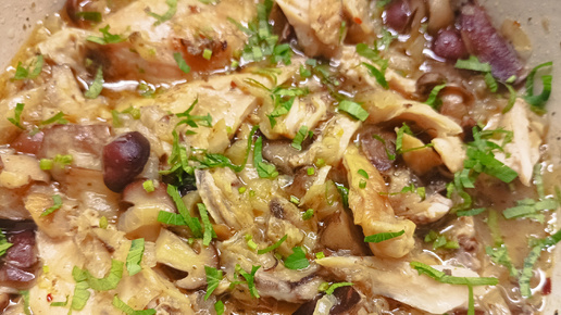 У нас в небольших магазинчиках (не сетевых) продаётся плечо индейки, самая его мясистая часть, по 300 рублей за килограмм. Я не могу пройти мимо, тем более, что можно выбрать, крупные или небольшие плечи купить. Крупные плечи тянут на 500-600 гр. Вот с такими кусочками я и готовлю очень ленивое, абсолютно бесхлопотное, сытное блюдо. Главный принцип: сотейник или кастрюля должны быть толстостенными, лука должно быть примерно половина от веса мяса, а грибы подойдут любые. Всего 3 продукта понадобится для приготовления, специи по вкусу и желанию, ну и несколько часов почти без участия готовящего...