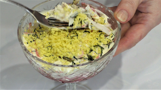 Попробуйте приготовить салат из крабовых палочек по моему рецепту. Необычно, но вкусно