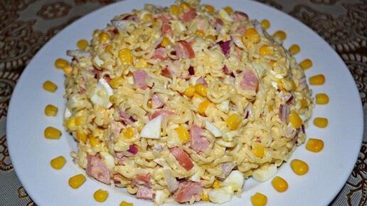 Необыкновенный, не дорогой и вкусный салат с лапшой Ролтон быстрого приготовления. Ингредиенты Лапша Ролтон 2 упаковки с любым вкусом (можно экспериментировать). 3 яйца куриных. Кукуруза, консервированная 200-250 грамм. Колбаса копченая, можно сырокопченая (так вкуснее). Сыр твердый, желательно пармезан. Майонез. Черный перец молотый. Соль две щепотки. Приготовление. 1. Сварить яйца в крутую и остудить, очистить от скорлупы. 2. Приготовить лапшу Ролтон по инструкции, но перед этим разломать ее на мелкие частички прямо в самой упаковке...