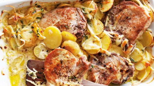 Продолжаем серию вкусных рецептов блюд, приготовленных в духовке. Сегодня запечём свиную вырезку на кости с картофелем и луком под сырно-сливочным соусом. Уверяю, равнодушных к этому блюду не останется! Приготовим: 1 кг молодого картофеля; 1 шт репчатого лука средней величины; 10 г свежего тимьяна; 100 мл овощного бульона; 2 столовые ложки оливкового масла; 4 средних кусочка жареной свинины с косточкой; 200 мл сливок 30%-ной жирности; 1 столовая ложка дижонской горчицы; 200 г тертого сыра Эдам; молотый чёрный перец; соль...