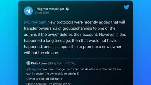 Команда Telegram в своём Twitter-аккаунте рассказала, что с недавнего времени в мессенджер был внедрён новый протокол, отвечающий за передачу прав собственности над каналом или групповым чатом. Этот процесс происходит в случае удаления учётной записи их прежнего владельца. Передача прав в каналах • Владение передаётся одному из администраторов, имеющему разрешение на публикацию сообщений. • Наличие других прав повышает вероятность трансфера. • Если администратор не может публиковать сообщения, он не сможет стать новым владельцем канала...