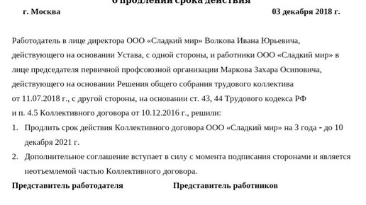 Как продлить коллективный договор Пролонгация коллективного договора регламентируется ст. 43 ТК РФ. В ней указано, что продлить соглашение можно максимум на три года. Порядок продления (изменения, дополнения) может быть таким же, как и в случае принятия первичного колдоговора (ст. 44 ТК РФ). В этом случае одна из сторон должна направить другой стороне письменное предложение о начале переговоров. Представители другой стороны должны вступить в переговоры в течение установленного законодательством срока – 7 календарных дней (ст...
