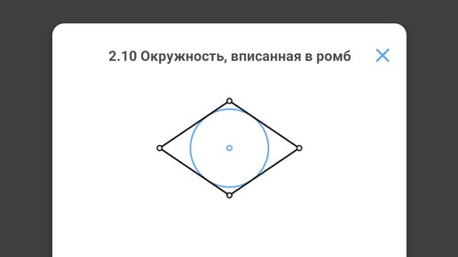 XIce 2 года назадПодписатьсяОкружность вписанная в ромб1. Строим прямые. Для построения центр ромба. 2. Строим перпендикулярную проходящую через центр ромба. 3. Строим вписанную окружность.