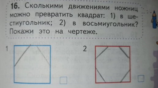 ШКОЛЬНИК2 года назадПодписатьсяСкольким движениями ножниц можно превратить квадрат: 1)в шестиугольник; 2) в восьмиугольник? Покажи на чертеже.