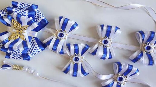 Уверяем вас, если вы повяжете своей дочери в школу или на праздник такую ленту, то она будет в центре всеобщего внимания. А юные принцессы это очень любят. Предлагаем подробное руководство, которое позволит выполнить самостоятельно предложенное украшение канзаши. Приведем поэлементную раскладку фурнитуры для легкости заготовки. На один маленький бантик понадобится: В процессе моделирования необходимо сделать 6 маленьких бантиков и 5 серединок (1 маленький бантик станет частью основного верхнего банта)...