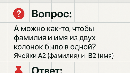 А можно как-то чтобы фамилия и имя из двух колонок было в одной? Ячейки А2 (фамилия) и В2 (имя). Онлайн-школа Excel МозгоЁж