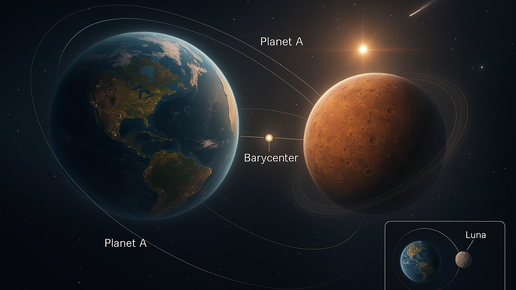 В представлении большинства людей планета — это объект, вращающийся вокруг звезды. Но астрономия знает немало интересных явлений, одно из которых — двойная планета. Это не научная фантастика, а вполне обсуждаемая в научных кругах гипотеза. Так что же такое двойная планета, и возможно ли существование таких систем? Двойная планета — это система из двух небесных тел, которые: Такое определение отличает двойную планету от обычной планеты со спутником. Например, Земля и Луна — яркий кандидат на звание двойной планеты, но пока что они не соответствуют критерию №3: барицентр находится внутри Земли...