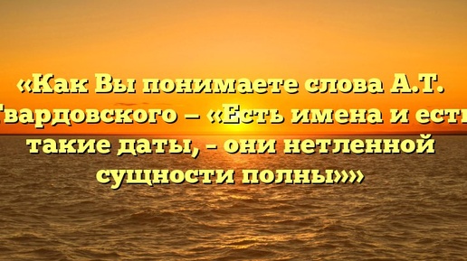 «Как Вы понимаете слова А.Т. Твардовского — «Есть имена и есть такие даты, – они нетленной сущности полны»» 7 лучших сочинений на тему «Как Вы понимаете слова А.Т. Твардовского — «Есть имена и есть такие даты, – они нетленной сущности полны»» Публикуем свежие сочинения 2025 года по теме «Как Вы понимаете слова А.Т. Твардовского — «Есть имена и есть такие даты, – они нетленной сущности полны»». «Как Вы понимаете слова А.Т. Твардовского — «Есть имена и есть такие даты, – они нетленной сущности полны»»: Вариант 1 Как я понимаю слова А...