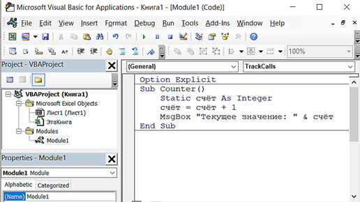 При написании программ на VBA иногда возникает необходимость сохранять значение переменной между вызовами подпрограммы или функции. Для этой цели можно использовать статические переменные. Статическая переменная - это переменная, которая сохраняет свое значение между вызовами подпрограммы или функции. В отличие от обычных локальных переменных, которые создаются и уничтожаются каждый раз при вызове подпрограммы или функции, статическая переменная сохраняет свое значение и состояние даже после выхода из подпрограммы или функции...