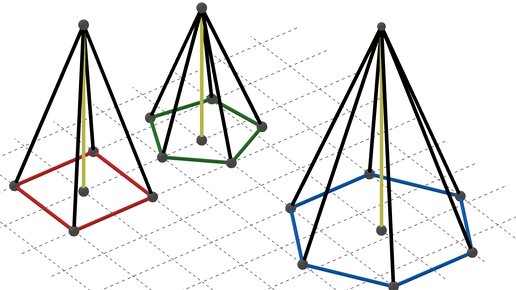 Пирамида представляет собой многогранник, основанием которого является произвольный многоугольник. Боковые грани пирамиды – треугольники с общей вершиной. Различают треугольные, четырехугольные, пятиугольные и n – угольные пирамиды, в основании которых лежит n – угольник. У четырехугольной пирамиды 5 граней, 5 вершин и 8 ребер, у пятиугольной пирамиды уже 6 граней, 6 вершин и 10 ребер. В шестиугольной пирамиде соответственно уже 7 граней, 7 вершин и 12 ребер. Вычислить количество граней, ребер и вершин у любой n-угольной пирамиды можно тут...