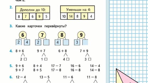 Уменьши на 4:10 − 4 = 614 − 4 = 108 − 4 = 49 − 4 = 54 − 4 = 0 Номер 3. Какие карточки перевернуты? Ответ: Номер 4. Ответ: 4 6 4 6 Номер 5. Ответ: 9 + 6 = 15 8 + 4 = 12 17 − 7 = 109 + 7 = 16 8 + 5 = 13 17 − 8 = 9
