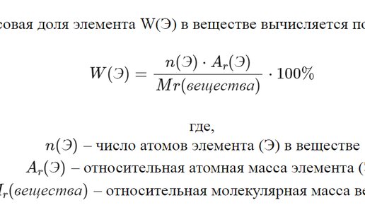 Массовая доля элемента в веществе – это отношение массы данного элемента к общей массе вещества, умноженное на 100%. Она показывает, какую часть массы составляет данный элемент в общей массе вещества и является важным параметром при изучении химических соединений. Разберем как находить массовые доли элементов вещества на примерах. Для примера возьмём молекулу сероводорода H2S. Молекула сероводорода состоит из двух атомов водорода (H) и одного атома серы (S). Познакомиться с понятиями относительной молекулярной и атомной масс, а также как находить их значения можно в данной статье...