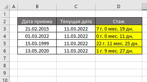 Как посчитать стаж работы и вывести результат в формате: «1 г, 1 мес, 10 дн»