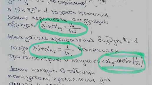 Задача: Вычислить предельный угол полного отражения для плексигласа и алмаза. Решение: Задачка в принципе очень простая, решается одной формулой. Но всё же нужно вспомнить немного теории. Для начала вспомним, что угол падения при переходе из более плотной среды в менее плотную, всегда меньше угла преломления. Соответственно при каком то максимальном значении угла падения, угол преломления достигнет максимального значения в 90* и начнёт распространяться вдоль границы двух сред...