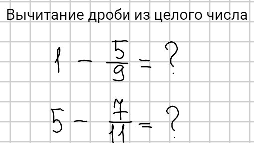 Это действие вызывает сложности у моих учеников! А все довольно просто! Давайте разберем на примерах. Рассмотрим самые простой случай. Будем из единицы вычитать дробь. Чтобы из единицы вычесть дробь, надо единицу представить в виде дроби, числитель и знаменатель которой равны знаменателю вычитаемого, а затем выполнить вычитание дробей с одинаковыми знаменателями. Пример. Далее рассмотрим вариант, когда целое число больше единицы. Чтобы из целого числа вычесть дробь, надо 1) представить его в виде смешанного числа...