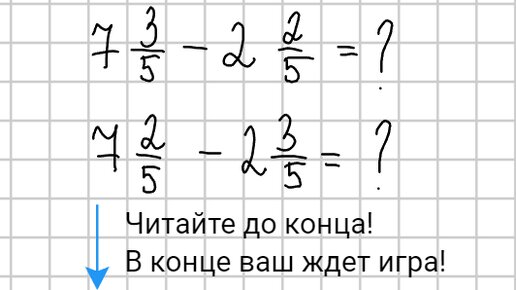 Разберем в этой статье как вычитать смешанные числа. Читайте до конца, так как в конце ваш ждет игра! При вычитании смешанных чисел, нужно вычесть отдельно целые части, отдельно — дробные, а затем полученные результаты сложить. Звучит все просто (на самом деле так и есть), но все же бывает примеры, которые вызывают вопросы: "А как это решать?" Итак, при вычитание смешанных чисел бывают две ситуации: Давайте рассмотрим на примерах. Пример 1. Когда дробная часть уменьшаемого больше дробной части вычитаемого...