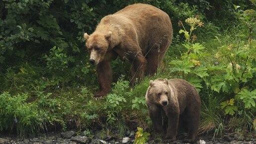 Кадьяк крупнее сибирского бурого медведя и гризли. Размером он сопоставим с древним короткомордым медведем. Кадьяк легко выворачивает вековые пни, ломает среднеразмерные стволы хвойных деревьев. Но несмотря на грозный вид и мощь, кадьяки миролюбивы...