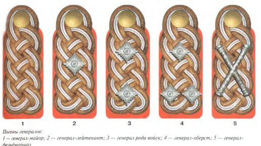 Основными знаками различия званий генералов практически на всех видах униформы, кроме летнего и зимнего маскировочных костюмов, являлись погоны единого типа. Не существовало никакого различия между погонами на мундире или шинели, парадной, повседневной или полевой униформе. В отличие от офицерских погон, генеральские были унифицированы и имели единую расцветку. Сами погоны были подобны штабс-офицерским по своей конструкции, но шнур для их плетения использовался не двойной, а тройной, причем крайние шнуры толщиной 4 мм имели золотой цвет, а средний — серебристый...