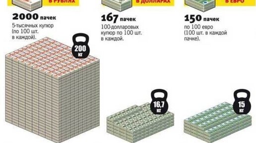 Миллиард рублей купюрами: по 10 ք (0,94 грамм) - 94 тонны; по 50 ք (0,97 грамм) - 19 тонн; по 100 ք (0,93 грамм) - 9,3 тонны; по 500 ք (0,97 грамм) - 1,94 тонны; по 1000 ք (1,04 грамм) - 1,04 тонны; по 5000 ք (1,02 грамм) - 200 кг...