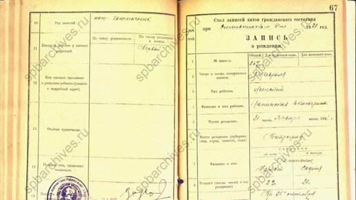 Вот пример того, как выглядят ранние документы советского периода: актовая запись о рождении за 1921 год из фондов Центрального государственного архива Санкт-Петербурга. Ознакомиться с этими актовыми записями можно в системе «Архивы Санкт-Петербурга», они отсканированы и доступны за умеренную плату...