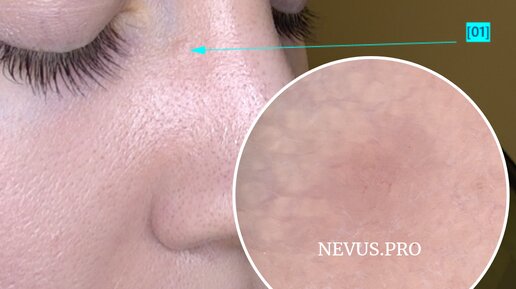 Девушке 27 лет, образование возникло около 1.5 лет назад. Очень неубедительно выглядела эта папула цвета окружающих тканей размером около 3-4 мм. При дерматоскопии еле заметны тонкие сосуды с незначительными признаками атипии. Рассматривала дерматоскопические снимки 20ти и 40ка кратного увеличения, диагноз был сомнительный. К решению о биопсии привело следующее: 1. Со слов пациентки образование периодически краснело (становилось более ярким) . 2. У отца девушки была базалиома в области лица . Принято решение о выполнении панч-биопсии образования...