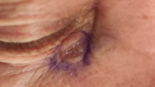 Девушке 27 лет, образование возникло около 1.5 лет назад. Очень неубедительно выглядела эта папула цвета окружающих тканей размером около 3-4 мм. При дерматоскопии еле заметны тонкие сосуды с незначительными признаками атипии. Рассматривала дерматоскопические снимки 20ти и 40ка кратного увеличения, диагноз был сомнительный. К решению о биопсии привело следующее: 1. Со слов пациентки образование периодически краснело (становилось более ярким) . 2. У отца девушки была базалиома в области лица . Принято решение о выполнении панч-биопсии образования...