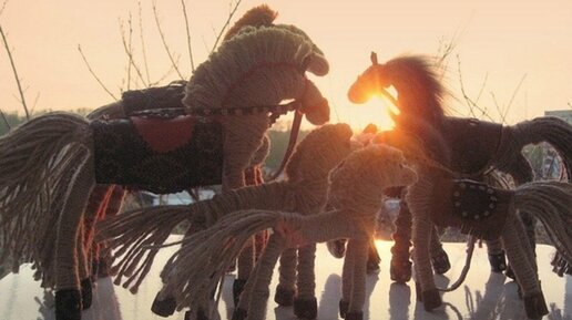 Понадобится - бечевка, немного желтой пряжи и тесьма для обмотки копыт. Нарежьте из бечевки пучки - 2 по 30 см, 1 -20 см и 5 по 15 см. Сложите длинный пучок пополам и привяжите к нему маленький, примотав его желтой пряжей. Привяжите таким же образом еще 4 пучка, получилась грива. Затем разделите длинный пучок пополам, подверните концы и замотайте бечевкой ножки...