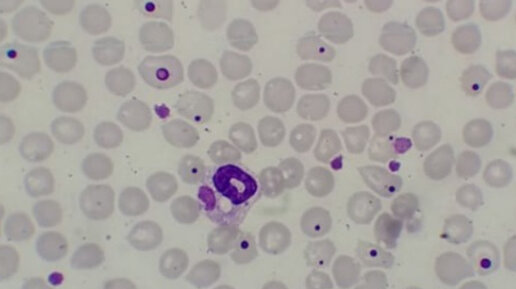 В мазке обнаружены тельца-включения, содержащие вирус чумы плотоядных. Включения на ранних стадиях крупные – до 3 мкм, округлой или овальной формы, цвет от синевато-серого до пурпурного. Именно тельца включения хорошо и ярко окрашиваются быстрыми красителями (Diff-Quick), по сравнению с краской Райта. Вирус чумы собак Canine distemper virus, CDV – одноцепочечный РНК вирус из семейства Paramyxoviridae, известен как Canine morbillivirus...