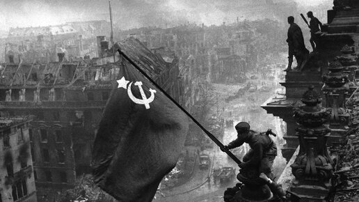 Знаменитая фотография флага СССР над рейхстагом в мае 1945 г.