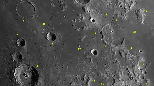 Очень интересное, масштабное фото, охватывает много кратеров и плоских поверхностей. Большая часть фото это плоская равнина застывшего грунта, бывшей жидкой фазы, жидкого моря, которое высохло и осело в виде плоской поверхности. Есть и немалое количество возвышенностей (19,12,6…) деформированных в период жидкой фазы. Есть старые кратеры разных размеров, которые были залиты жидкой фазой так, что уровень их плоского дна сравнялся с общим уровнем плоской поверхности (2,5,17, 21,9…). Все эти кратеры имеют разрывы от деформаций в окружающих воронку валах, куда затекала жидкая фаза...