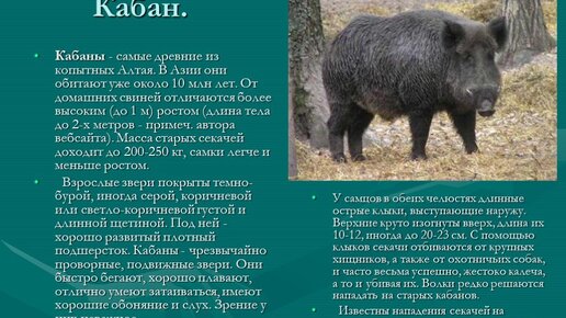Содержание Сегодняшний кабан — это один из самых крупных видов свинообразных. Он отличается своими большими клыками и густой шерстью. Кабаны обитают практически на всех территориях земли, особенно они распространены в стране великой Японии, где кабаны приходят вредом к фермерам, так как съедают их урожай. Особенности кабана в том, что это животное очень разъяренного образа. Кабаны имеют громкий и грозный голос, особенно когда они разъярены. Также кабаны живут в стадах и обладают определенными территориями, на которых они охотятся и размножаются...