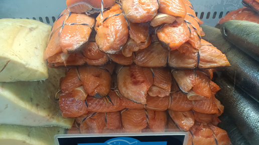 Это не является рекламой данных продуктов. Бывают ярмарки рыбные, привозные. Вот и я побывала на такой рыбной ярмарке. Выбор рыбы небольшой, но вкусный. И рыбы здесь деликатесные. Сделала несколько фото. Ещё не Новый год, а мы себя побаловали рыбой-чавычей. Была и другая рыба, просто я не фоткала. Чавыча, спинка, цена 340 рублей-100г. Фото автора Нерка холодного копчения, цена 249 рублей за 100 г. Юкола нерки холодного копчения, цена 290 рублей-100г. Фото автора Чавыча горячего копчения, цена 310 рублей-100г...