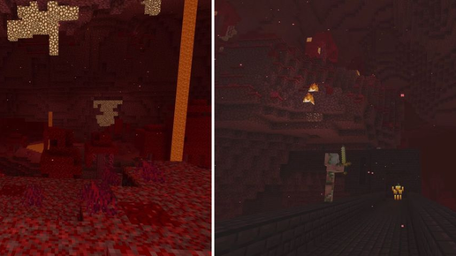 На обоих изображениях показаны пейзажи Нижнего мира в Minecraft, включая лаву, светящиеся камни и мобов.