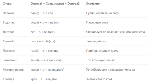 Основа — это часть слова без окончания (и без формообразующих суффиксов в глаголах). Основа содержит главный лексический смысл слова. Например: Сложение основ — это один из способов образования новых слов (словообразование), когда два корня (или две основы) соединяются в одно слово. Часто между основами ставится соединительная гласная (интерфикс) -о- или -е-. Правило выбора соединительной гласной: Вот несколько групп примеров, сгруппированных по частям речи. Без соединительной гласной: