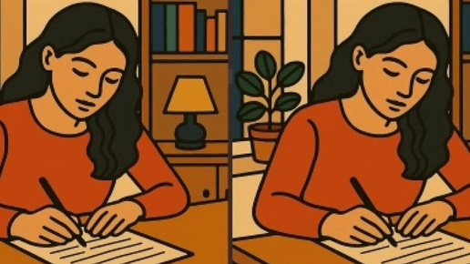 Кажется, здесь все спокойно: девушка пишет письмо, вокруг тишина и уют. Но не спешите расслабляться – в этой сцене есть подвох. У вас всего 18 секунд, чтобы его заметить. Такие задачки – короткая тренировка внимания без занудства. Они учат замечать мелочи, которые мозг обычно «дорисовывает» автоматически. Пара минут – и вы уже внимательнее читаете, быстрее ориентируетесь и реже пропускаете важные детали. На двух почти одинаковых рисунках девушка сидит за столом и пишет письмо. За ее спиной – полки с книгами, светильник и комнатное растение...