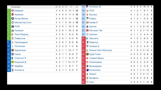 Здравствуйте, мои дорогие любители футбольной статистики. В ЕВРОКУБКАХ Завершена 4-я игровая неделя. Предлагаю взглянуть как выглядят таблицы трёх турниров после 4 тура. Смотрим на Лигу Чемпионов. Три клуба идут без потерь - Бавария, Арсенал, Интер. У всех по 12 очков. Два клуба не набрали ни единого очка - Бенфика и Аякс. 0 очков. Надеюсь, остальные клубы вы изучите самостоятельно, а мы переходим к следующему турниру...