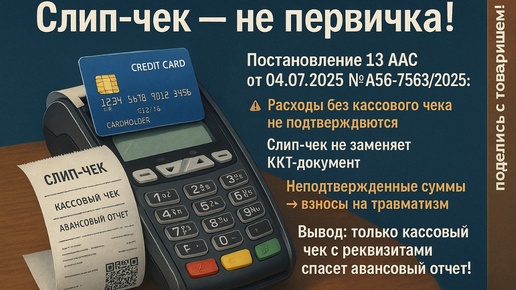 💳 Слип-чек ≠ документ для авансового отчета: суд поддержал фонд Суды подтвердили: расходы работников по слип-чекам не учитываются, а подотчетные суммы облагаются взносами на травматизм. 📜 Постановление 13-го ААС от 04.07.2025 по делу №А56-7563/2025: ✔️ Слип-чек не заменяет кассовый чек, его выдает терминал, а не ККТ. ✔️ Нет обязательных реквизитов (ИНН, место расчета, наименование товаров и т.д.). ✔️ Подотчетники обязаны сдавать авансовые отчеты с документами, соответствующими Закону о бухучете...