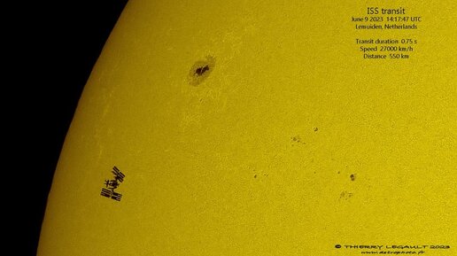 Французский астрофотограф Тьерри Лего поделился «невозможными» фотографиями. Энтузиасту удалось запечатлеть момент, когда МКС проходила по диску Солнца во время выхода двух астронавтов NASA в открытый космос. Снимки были сделаны 9 июня 2023 года, а опубликованы только сейчас. Ради снимков я проехал 6 часов от дома до Нидерландов, где пролет МСК мимо Солнца произошел ровно через час после выхода в открытый космос астронавтов NASA. Тьерри ЛегоНа этот раз МКС прошла над тремя группами солнечных пятен за долю секунды...