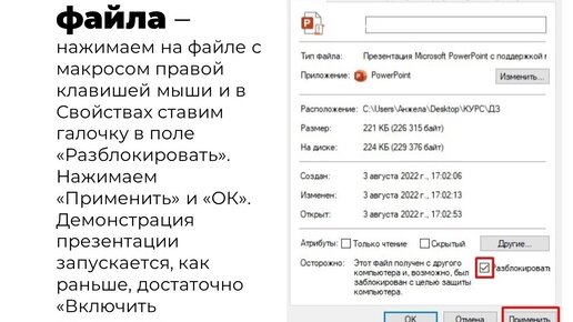 Нажимаем правой клавишей мыши по файлу с макросом, затем "Свойства" и устанавливаем галочку в "Разблокировать". Нажимаем "Применить" и "ОК". Презентация запускается, как и прежде, достаточно "Включить содержимое". ✅ СПОСОБ 2 через Доверенные папки