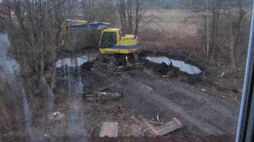 В 2014 году в деревенской местности я построил небольшой домик. Он находился на краю деревни, вокруг кусты и лес. Я обратил внимание, что напротив дома есть прекрасное место для пруда. Появилось жгучее желание выкопать пруд. Пруд копать решил в конце апреля, когда уровень грунтовых вод был очень высоким. ( На самом деле нужно копать в конце лета или в начале осени.) Экскаватору заехать было не реально. Для этого я брёвнами устелил колею для экскаватора. Потом водитель камаза скинул "грязный" отсев на эти бревна...