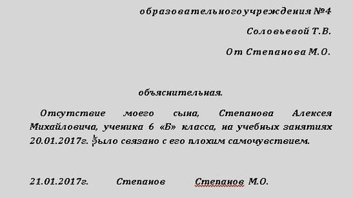 На днях столкнулась с такой проблемой. Дочка приболела, и я оставила ее на пару дней дома. Температуры не было, врача вызывать не стали, потому что пришлось бы, как минимум, неделю дома отлеживаться и бегать потом за справкой. Мы справились своими силами. В школу надо было написать объяснительную. В такие моменты обычно со словами для объяснительной туго) Объяснительная пишется от руки в произвольной форме, на имя директора учебного заведения, с указанием имени родителя и ученика, причины и даты отсутствия...