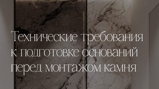 Технические требования к подготовке основания перед монтажом камня: 1. Основание пола Строго в горизонте, без перепадов и локальных неровностей (аналогично подготовке под плитку). 2. Примыкания стен и пола Под углом 90°. 3. Стены Ровные, без наплывов и отклонений по вертикали. Замер выполняется только после удаления всех посторонних элементов и коммуникаций в зоне монтажа. 4. Санузлы Обязательная гидроизоляция пола и стен. 5. Душевые поддоны из камня Основание делается без уклона...
